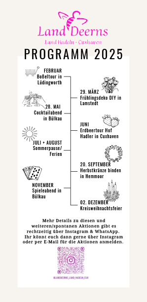 Hier findet ihr alle Infos zu uns LandDeerns und unser buntes Programm für dieses Jahr – von Aktionen über Treffen bis zu spannenden Events. Einfach herunterladen und keinen Termin verpassen!